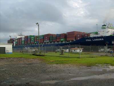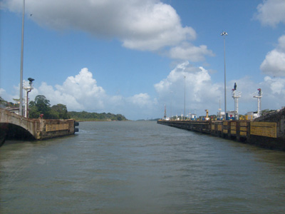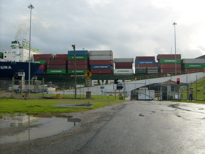 A huge container ship squeezes through the first Gatun Lock in the Panama Canal, southbound to the Pacific |