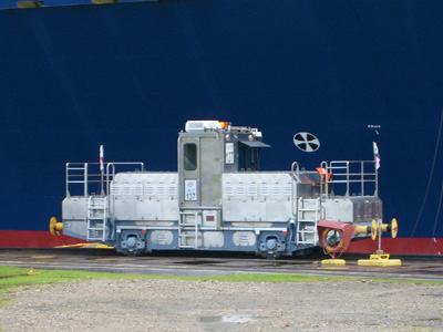 Small but powerful electric railway engines, called mules, heave the big ships along the Canal locks |